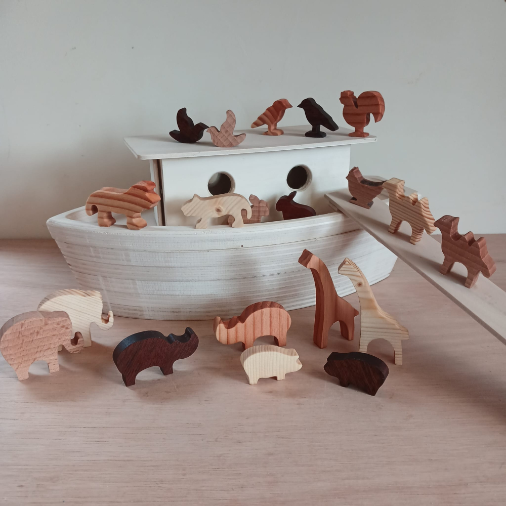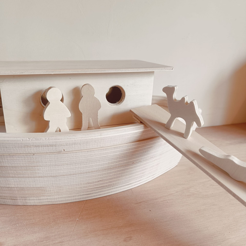 De ark is gemaakt van gelaagd populierenhout en is 37 cm lang, 17,5 cm breed en 16 cm hoog. Het wordt geleverd met 20 dieren, meneer en mevrouw Noach en een loopplank (36 cm)