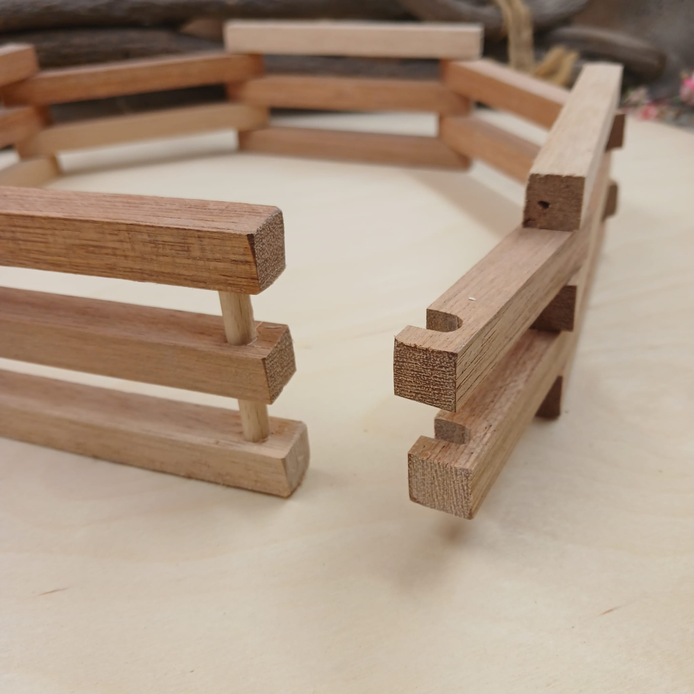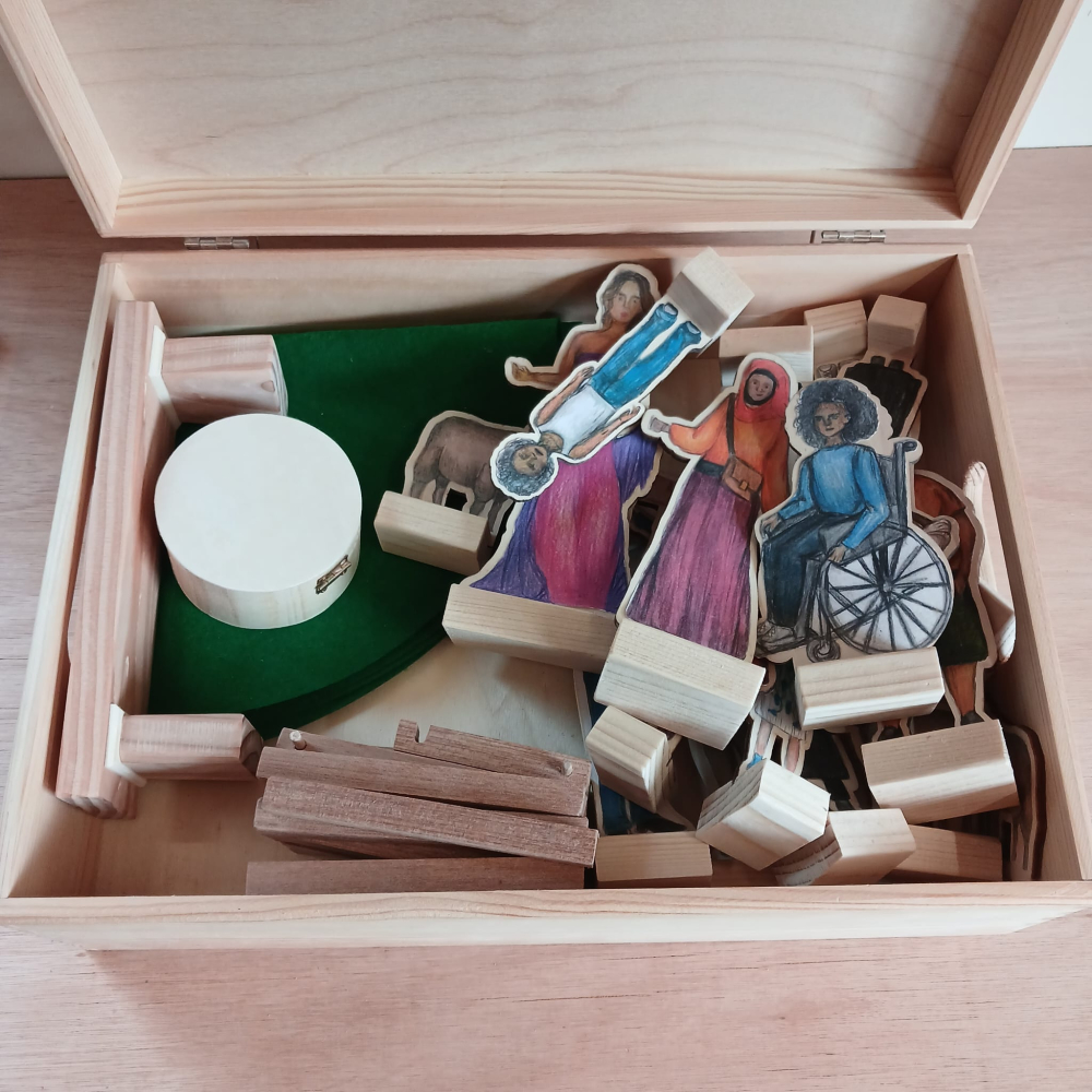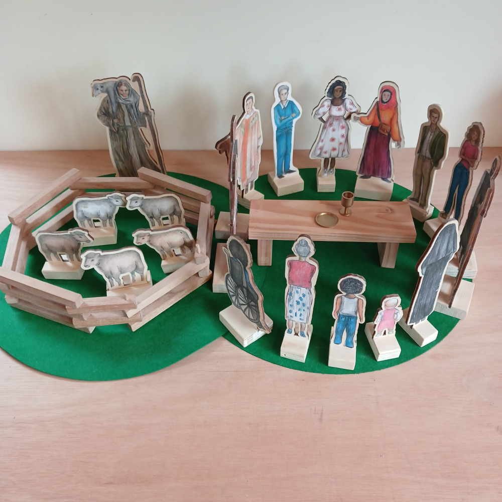 1 herder en 5 schapen. Dit wordt geleverd in blank hout, er komen geprinte afbeeldingen bij die zelf uitgeknipt en opgeplakt dienen te worden. Herder is 20 cm hoog, schapen zijn 7 cm hoog.