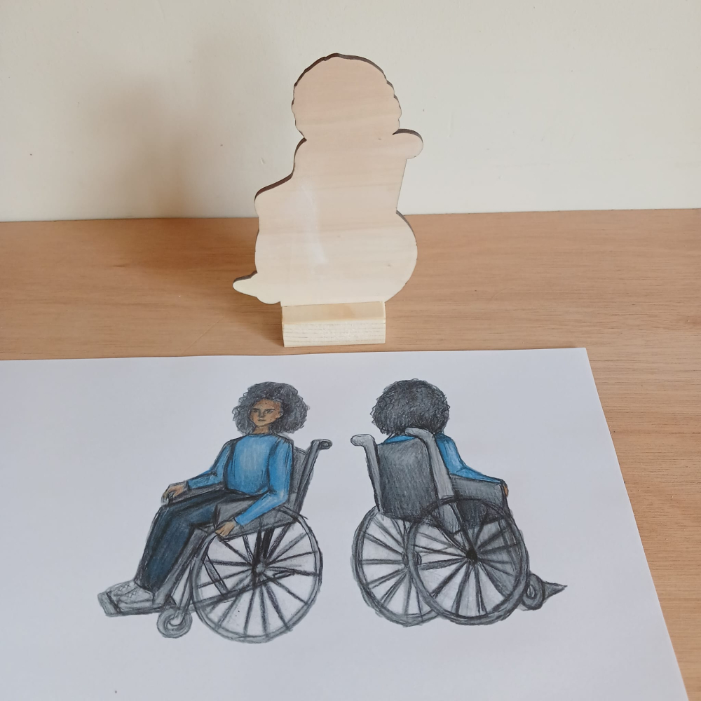 16 blank houten poppen met geprinte afbeeldingen die zelf uitgeknipt en gelijmd moeten worden. Dit kan heel goed met spuitlijm. De poppen zijn maximaal 19 cm hoog.