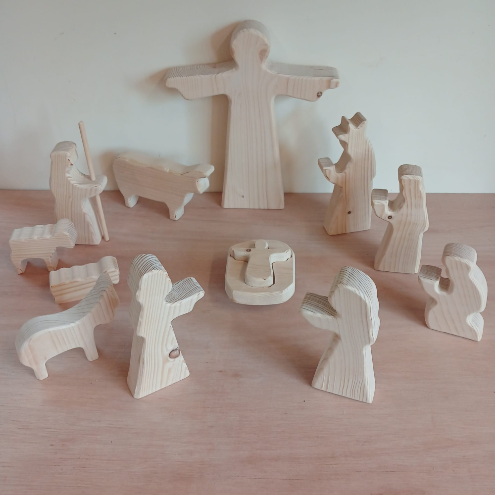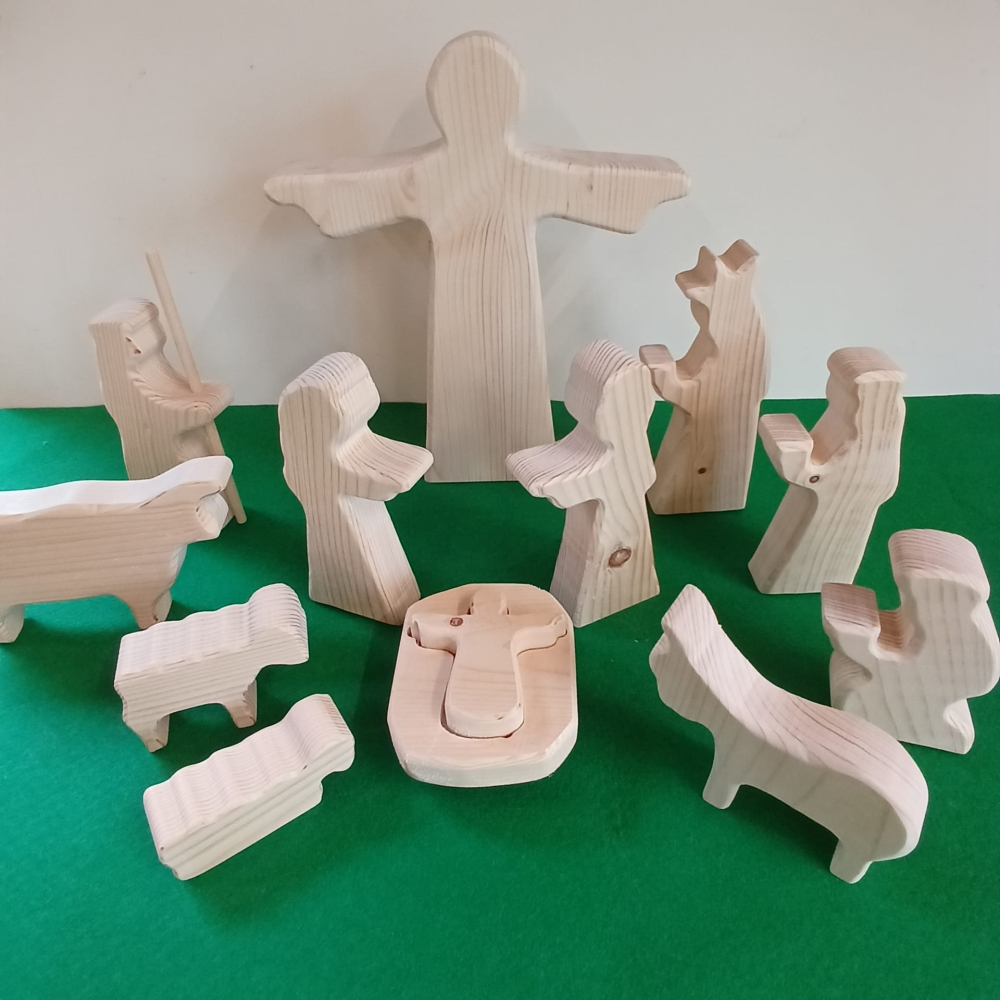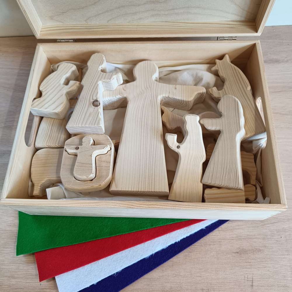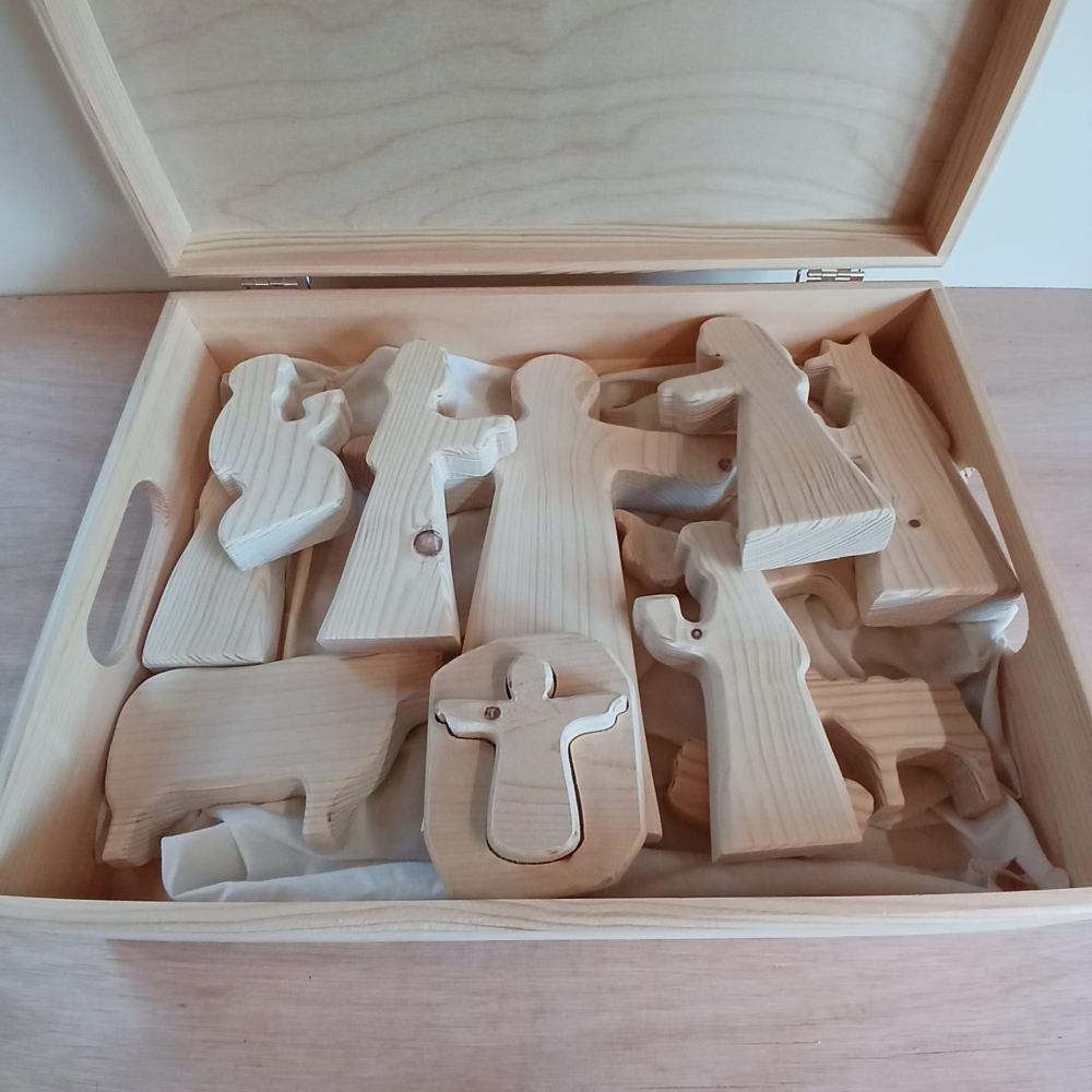 Christuskind in de kribbe (uitneembaar), Maria, Jozef, 3 koningen, 1 herder, 2 schapen, 1 ezel, 1 os. De figuren zijn tussen de 4 en 16 cm.