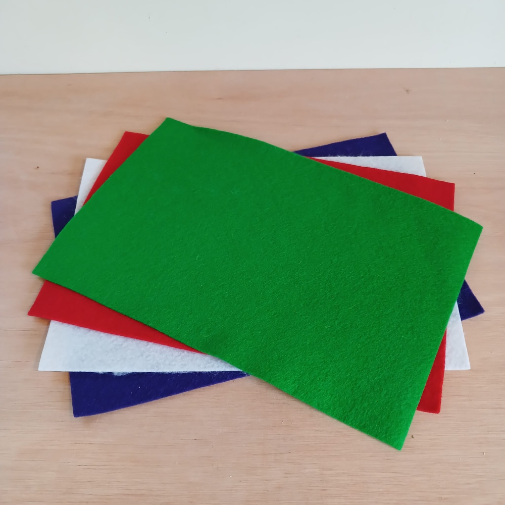 Vilten onderleggers in wit, rood, groen en paars, 30 bij 40 cm.